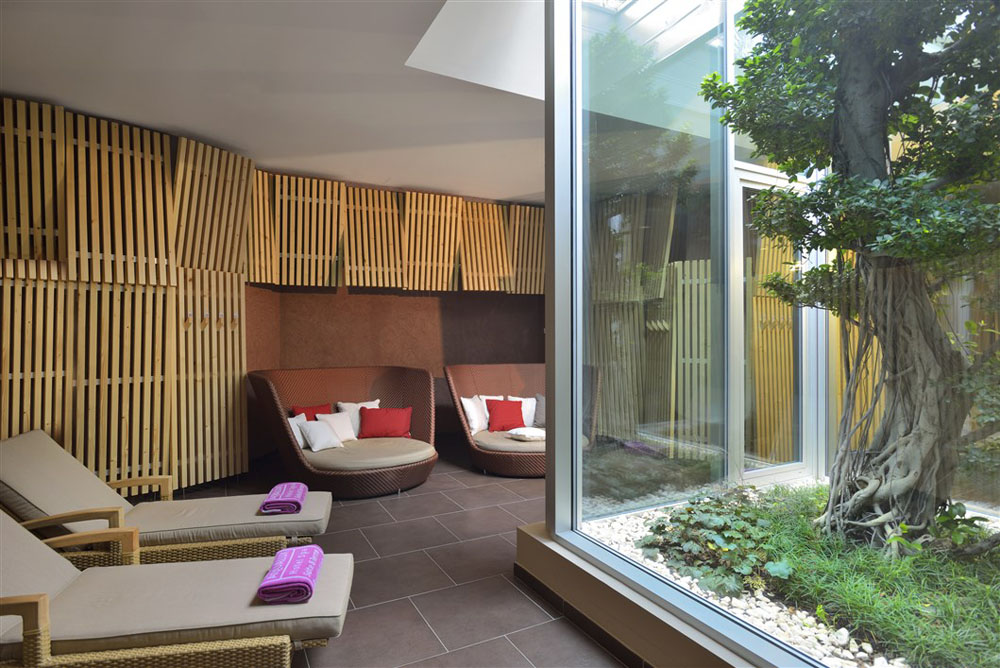 Das Aqualux macht seinem Namen Aqua = Wasser + Lux = Licht vor allem im Außenbereich alle Ehre. Der ruhige, mediterrane Innenhof mit Zypressen und Olivenbäumen ist das Herzstück des Wellness-Hotels. Hier befindet sich der große AquaExperience-Wasserpark mit insgesamt acht Innen- und Außenpools sowie verschiedenen Wasserparcours. Die Pools sind vorwiegend mit Thermalwasser gefüllt, es gibt aber auch ein Salzwasserbecken. Der großzügige Glasbau des Innenbereichs schafft eine harmonische Verbindung zum Außenbereich und sorgt für viel Tageslicht. Der Leitgedanke ist auch im 1.000 Quadratmeter großen AquaSpa & Wellness-Bereich der schonende Umgang mit natürlichen Ressourcen.