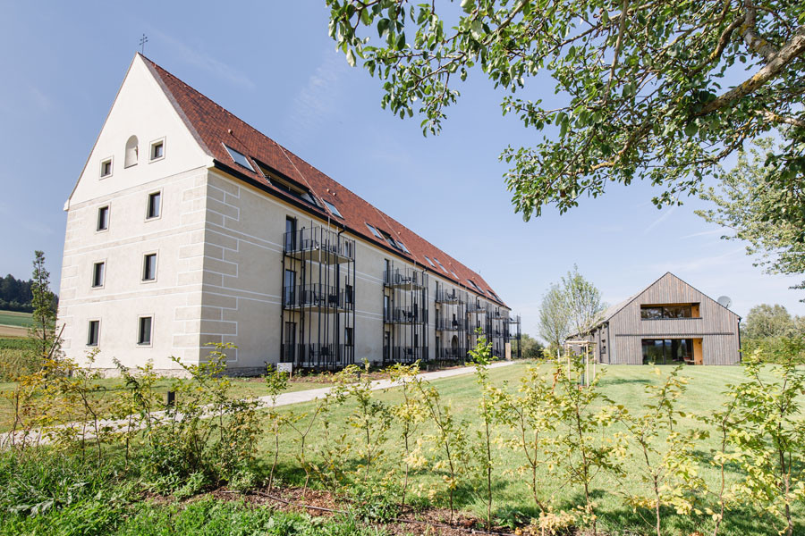 Der 320 Jahre alte Getreidespeicher wurde liebevoll restauriert und mit neuem Leben gefüllt. Ein Ensemble aus einem historischen Bauwerk, einem idyllischen Wohlfühlgarten, zwei modern ausgestattete Seminarräume sowie einem exklusiven Rooftop-Spa mit zwei Saunen und traumhaftem Ausblick. Ein Ort für alle, die Ruhe und Natur suchen und das Leben in vollen Zügen genießen wollen. Die äußere Gebäudehülle des ehemaligen Getreidespeichers blieb nahezu unverändert – im Inneren wurde alles neu: Auf drei Ebenen erwarten Sie 37 moderne Zimmer & Ferienapartments von 24–107 m². Genießen Sie die Schönheit der Natur in vollen Zügen und fühlen sich dabei wie zu Hause. Ästhetik trifft auf Langlebigkeit. Heimische Eichen dielen auf zeitgemäße technische Ausstattung. Fußboden- als auch Wandheizungen sorgen für modernen Komfort, der durch nachhaltige Energiegewinnung vor Ort sichergestellt wird. Zur Auswahl stehen Doppelzimmer ohne Balkon, Juniorsuiten mit oder ohne Balkon und Suiten mit Balkon. Die Energieversorgung wird mittels einer Holz-Hackschnitzel-Anlage gewährleistet, die in partnerschaftlicher Kooperation mit Landwirten der Umgebung betrieben wird. Erdwärme-Kollektoren und eine Wärmepumpenanlage tragen zur nachhaltigen Wärmeversorgung bei. Die Betonkernaktivierung ermöglicht effiziente Wärmespeicherung. Die großflächige PV-Anlage auf dem Dach trägt zur umweltbewussten Energieerzeugung bei und 8 E-Ladestationen stehen für die Gäste bereit.