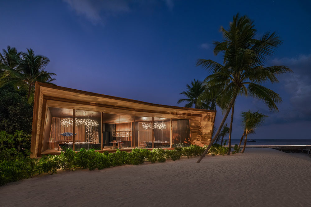 Nach einer 45-minütigen Anreise mit dem Wasserflugzeug werden die Gäste von einem architektonischen Wunderwerk begrüßt, das sich nahtlos in die natürliche Umgebung einfügt. Die unverwechselbaren Designelemente des Resorts, darunter insgesamt 77 Villen, von denen 44 Überwasservillen die Form eines Mantarochens haben, und eine charakteristische Bar, die einem majestätischen Walhai ähnelt, fangen die Essenz der maritimen Schönheit der Malediven ein.