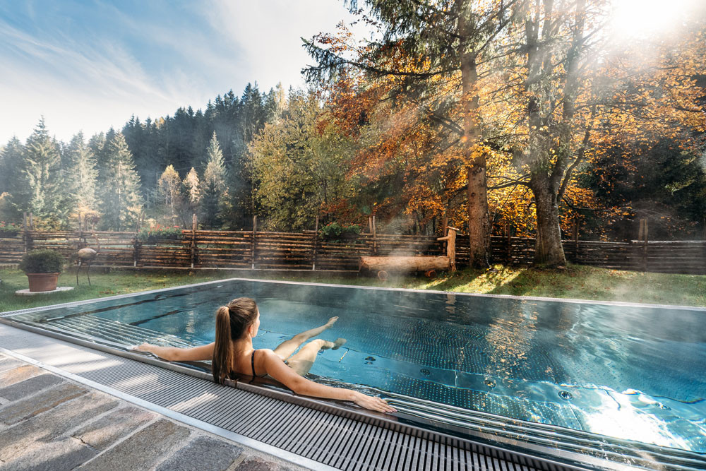 Der hoteleigene „Wald-Wellness“-Bereich ist genau der richtige Ort für ein Entspannungsbad der Gefühle. Die Panorama-Sauna mit Blick in die Natur sowie der beheizte Außenpool sind ein wahres Highlight. Im Ruheraum mit Kuschelkojen können Erholungssuchende die Seele baumeln lassen. Für noch mehr Entspannung sorgen Yoga- & Meditations-Einheiten sowie ein breites Angebot an Wohlfühlmassagen & Naturkosmetikbehandlungen. Auf die sportlichen Gästewartet der Panorama-Fitnessraum. Die beiden ortseigenen Thermen bieten alpine Wellness auf höchstem Niveau.