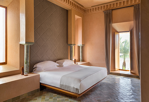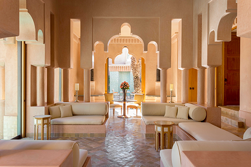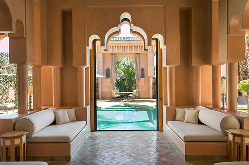 Amanjena, das „friedliche Paradies“, wurde erst vor kurzem nach einer umfassenden Renovierung wiedereröffnet und die Pavillons und Maisons (wohlgemerkt: keine Zimmer) erstrahlen in neuem Glanz. Jeder Pavillon (175 m²) hat nicht nur einen Innenhof mit Springbrunnen und Sitz ecke, sondern ist auch von einer spektakulären domartigen Kuppeldecke gekrönt. Die Innenausstattung des Schlaf- und Wohnbereichs mit offenem Kamin ist elegant, bietet alle modernen technologischen Errungenschaften und gipfelt in einem geräumigen Badezimmer aus grünem marokkanischen Marmor. Mit ihren rötlichen Säulen, erdigen Tönen und türkisfarbenen Elementen im Pool und Wasser becken, spiegelt das Amanjena die Farben der Olivenhaine, Berberdörfer und des Atlasgebirges in der Umgebung wider. Die luxuriöse Anlage samt beeindruckender Eingangs-Kolonnade mit Boutique, Spa, Bibliothek, Tennisplätzen und mehreren Restaurants, könnte zweifellos auch ein Palast des Königs sein, der übrigens nur 10 Autominuten entfernt bei der Medina und dem berühmten Platz der Gaukler, Akrobaten und Schlangenbeschwörer, Djemaa El Fna, liegt. Noch näher am Resort liegen die großartigen Golfkurse Amelkis, Al Maaden und das Atlas Golf Resort.