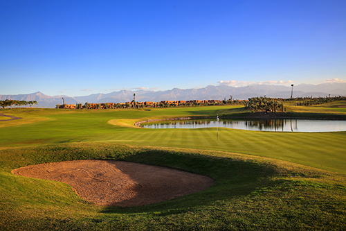 Im Hintergrund das Atlasgebirge mit seinen schneebedeckten Gipfeln, wurde dieser Golfplatz homogen in die wüstenähnliche Landschaft integriert. Bei der Konzipierung dieses Platzes erhielt der Schutz und die Bewahrung der ursprünglichen Natur eine besonders große Bedeutung. So sind z.B. nur 45 % des Kurses bepflanzt, um den Wasserverbrauch so minimal wie möglich zu halten. Bestehende Pflanzen wurden erhalten und einige Palmen, Kakteen und Olivenbäume kamen hinzu. Ein absolutes Erlebnis!