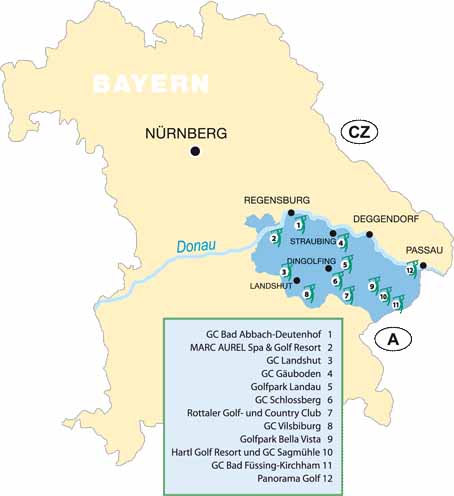 Mit über 40 erstklassigen Golfplätzen in der Region und den angrenzenden Gebieten sowie Europas größtem Golfresort in Bad Griesbach mit eigener Golfakademie und speziellem, patentierten Lehrsystem ist die Region ideales Ziel für Golfspieler – nicht zuletzt auch dank der einzigartigen Kombination von Golfspiel und Thermen-Landschaft. Auch rund um die Welterbestadt Regensburg findet man einen sensationellen Klassiker: zwar nicht aus dem Mittelalter, sondern 1969 eröffnet, auf den Gründen der Fürsten zu Thurn und Taxis schlängeln sich rund um das stilvolle Jagdschloss, das mit seinen holzgetäfelten Clubräumen schon das edle Ambiente versprüht, beeindruckende nicht allzu lange (5.734m bei Par 72) 18 Spielbahnen des Golf- und Landclub Regensburg, der zweifellos zu einem der schönsten Golfkurse in Deutschland zählt. Ebenfalls nur 20 Minuten vom Zentrum Regensburg wartet die 27 Lochanlage des GC Gut Minoritenhof. Der 18 Loch Meisterschaftsplatz führt in der zweiten Hälfte seine Spielbahnen entlang der Donau: Idylle und Natur pur. Und wer glaubt die seien durch die Regenfälle ständig überschwemmt, der irrt. Da die Donau unweit entspringt ist sie noch ziemlich klein, seit Bestehen des Clubs 1998 gab es keinerlei Überflutungen.
