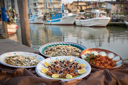 „Klein-Venedig“, so wird Caorle von den Einheimischen oft genannt. Und das zu Recht, denn in dem Städtchen an der Adria gibt es viel zu entdecken: die bunten Häuser in venezianischen Farben, die kleinen Gassen der Altstadt, schicke Cafés, der kleine Hafen, romantische Fischlokale, der Dom mit seinem Glockenturm, die Wallfahrtskirche Madonna dell’Angelo am Ende der von Klippen mit Fels-Skulpturen umrahmten Strandpromenade und natürlich der 18 Kilometer lange Sandstrand. Das 11.000-Einwohner-Städtchen mit seiner romantischen Altstadt ist ein wahres Juwel. Es liegt an der Adria-Mündung des Flusses Livenza, das Meer oder die Lagune sind immer im Blickfeld. Kulinarisch dreht sich in Caorle vieles um das Thema Fisch. An jeder Ecke können Sie Meerestiere vom Feinsten genießen: in den kleinen Restaurants, in den Casoni – den traditionellen Fischhütten mit den Schilfdächern, oder bei einem Bootsausflug in der Lagune. Sehr empfehlenswert ist ein Besuch des tradtionellen Fischmarktes in Hafennähe, wo alles Fangfrisch zum Verkauf angeboten wird. Folgende Spezialitäten haben wir begeisternd verköstigt: Moscardini – die Moschustintenfische, „Sardèe in saòr“ – frittierte Sardinen in einer Marinade aus Öl, gebratenen Zwiebeln, Salz und Essig, oder Vongole. Jedes Jahr im Herbst steht in Caorle das traditionelle Fischfest auf dem Programm. Die Fischer höchstpersönlich sind es, die hier Sardinen frittieren, grillen oder mit Polenta servieren. Das Fest findet am „Sacheta“-Strand statt, dem Strandbereich neben der Kirche Madonna dell’Angelo. Direkt im Sand werden dafür Ess-Stände, Grills, Kiosk-Bars und Tische für die Gäste aufgebaut. Die Regatta anläßlich des Fischfestes kann gut von der Klippe oder dem Landungssteg gleich neben der Kirche verfolgt werden, Live-Musik und Theatervorführungen komplettieren das Programm.