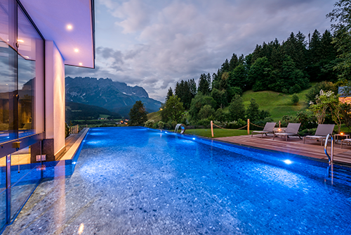 In dem Genuss- und Lifestyle-Hotel in Ellmau genießen Urlauber die individuell perfekte Auszeit vom Alltag und erleben das besondere Flair der Tiroler Alpen. Ursula und Andreas Windisch verwirklichten Ihre Vision und gaben dem Haus eine neue Atmosphäre. Ein Highlight ist ganz sicher der 20 Meter lange, ganzjährig beheizte Infinity Pool mit Bergblick. Das Badehaus mit Hallenbad, Panorama-Ruheraum mit Kamin und Saunalandschaft lädt zum Entspannen vor einer Traumkulisse ein. In den neuen, individuell gestalteten Zimmern und Suiten mit Kaiserblick trifft Komfort auf Understatement. Eleganz auf lässige Sportlichkeit. Dabei sorgen die hellen Eichenholzböden für ein entspanntes Gefühl der Leichtigkeit. Edle Stoffe geben dem Raum eine elegante Note. Tiroler Loden schenkt dem Raum ein charmantes alpines Flair.