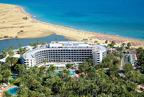 Das Seaside Palm Beach liegt inmitten eines üppigen Palmenhains, unmittelbar an den Dünen und nur 50 m vom berühmten Sandstrand von Maspalomas entfernt. Das luxuriöse Fünf-Sterne-Hotel wurde von dem Pariser Stardesigner Alberto Pinto im bunten Retro-Stil der 1970er-Jahre in Szene gesetzt und mit klaren Linien und einer neuen Schlichtheit erbaut. Neben den Zimmern wurden auch die öffentlichen Bereiche des Hotels im Retro-Chic gestaltet, Familien mit Kindern fühlen sich hier genauso wohl wie erholungssuchende oder sportbegeisterte Singles und Paare. Für die Gestaltung der insgesamt 328 Zimmer und Suiten wurden ganz bewusst vier unterschiedliche Farbkombinationen gewählt, wobei die kraftvollen Farben der Wände einen Bezug zur untergehenden Sonne bilden und die kühleren Farben der Böden an Meer und Strand erinnern. Die Zimmer und Suiten sind alle vom Feinsten ausgestattet und vom Balkon aus blickt man entweder auf den üppigen Garten, den im Palmenhain liegenden Pool oder auf die Dünen sowie das Meer.