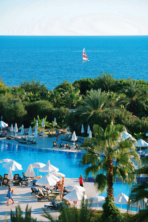 Der Fünf-Sterne Chervo Club Sirena liegt direkt am Strand, rund 25 Kilometer vom Flughafen Antalya und vier Kilometer von Kadriye entfernt. Auf einer Gesamtfläche von 180.000 Quadratmetern befinden sich 453 Zimmer, die auf zwei Hauptgebäude und fünf Bungalowgebäude aufgeteilt sind.