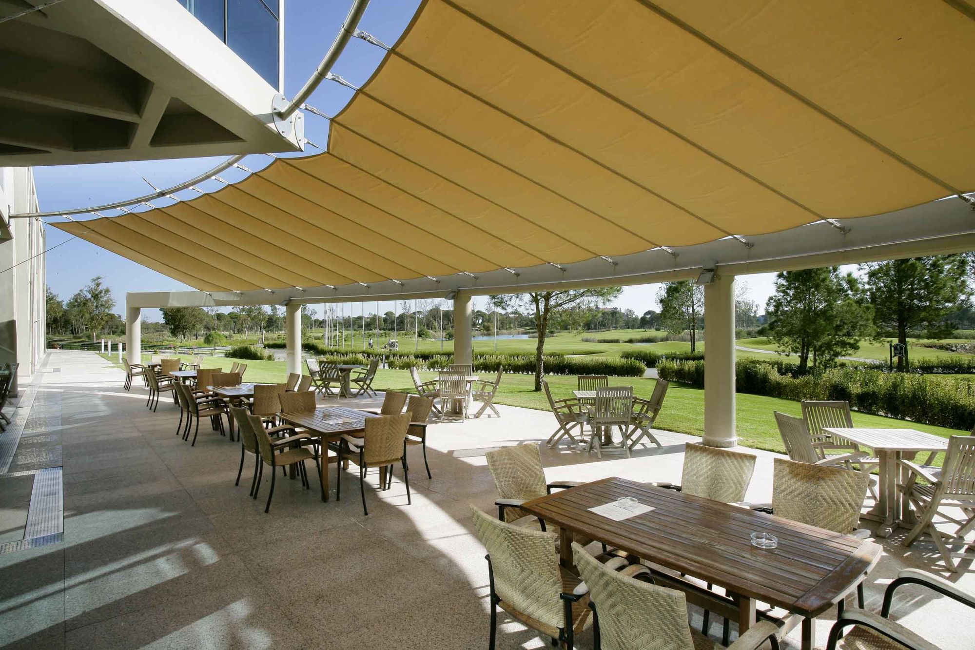 Auf der großzügigen, überdachten Terrasse lassen sich nach der Runde wunderbar die Erlebnisse bei lokalem Bier und einem ausgezeichneten Clubsandwich erzählen.